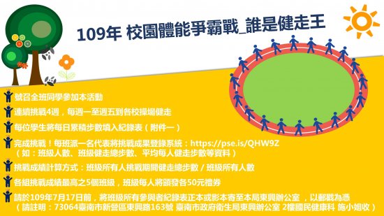 兒童每天至少要從事 60 分鐘中重強度的身體活動,會改善慢性疾病危險因子;「健走」是容易落實在日常生活中的入門運動,為鼓勵學童健走,建立動態生活型態,特辦理本活動。