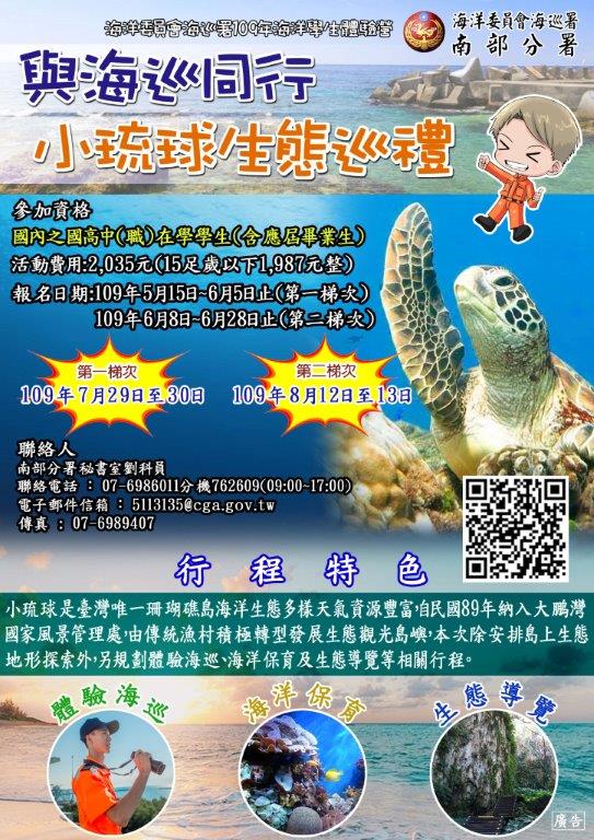 三、檢附活動宣傳單 A4 及 109 年海洋學生體驗營(國高中職)-與海巡同行-小琉球生態巡禮活動報名簡章各 1 份,敬請貴校鼓勵所屬青年學子踴躍報名參加,相關報名資訊,詳如活動報名簡章。