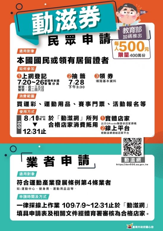 二、本國國民或持有居留證者於 7 月 20 日至 7 月 26 日至「動滋網」登錄基本資料參與抽籤,中籤者即可獲得 500 元電子抵用券,可使用於運動場館、觀賞運動賽事、參加體育活動、購買運動用品等相關運動產業。