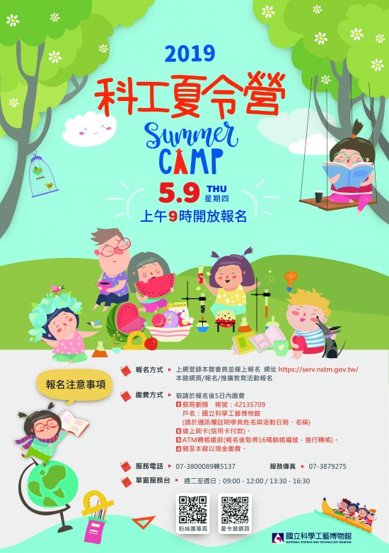 一、本館辦理 108 年度科工夏令營系列活動,辦理期間自 6 月 29 日起至 8 月 3 日,共計 101 場次,活動計有國際營隊、館外活動、美學創作、生活科學、天文、玩具科學、物理化學與數學、幼兒創藝、生物世界、創意積木、軟體應用、食品科學、動力機械、樂高與機器人等多元主題營隊,詳情請參看活動專屬網站https://education.nstm.gov.tw/summercamp/。