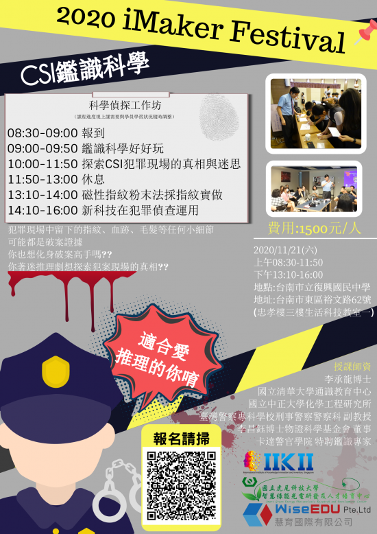 一、本科學營介紹跨人文科技領域的鑑識科學和犯罪現場,從好玩的鑑識科學歷程,血跡噴濺分析原理,血腥的犯罪現場照片,教導學生了解犯罪調查的科學程序,最後探索社會大眾關注的冤獄問題,引導帶入數位新科技的 3D 掃描、 3D 列印、虛擬實境(VR) 和擴增實境(AR),配合 3D 動畫和虛擬實境的 3D 影像合成,運用在犯罪現場調查、重建與培訓教育的領域,找出破案關鍵,一起來見證鑑識科學的未來。