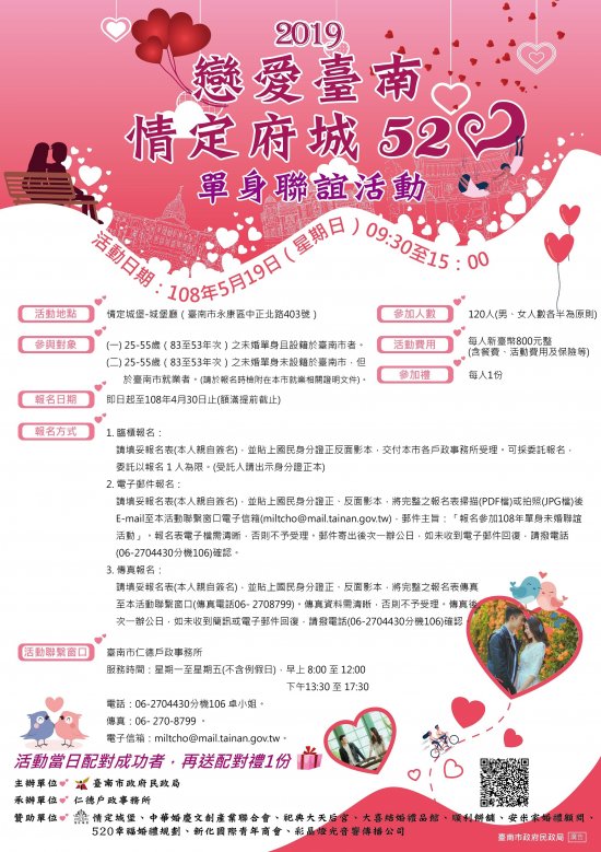 臺南市政府「戀愛臺南~情定府城 520」單身未婚聯誼活動,即日起至 4 月 30 日止受理報名,歡迎踴躍參與,詳情請逕洽本市各戶政事務所( https://reurl.cc/Ab0dE