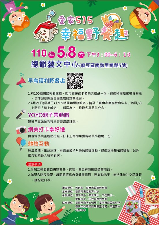 (五)前 100組網路報名家庭可獲得精美禮品,額滿為止,自 4 月 21 日(星期三)上午 9 時起開始報名,報名網址:https://reurl.cc/kV25Wr