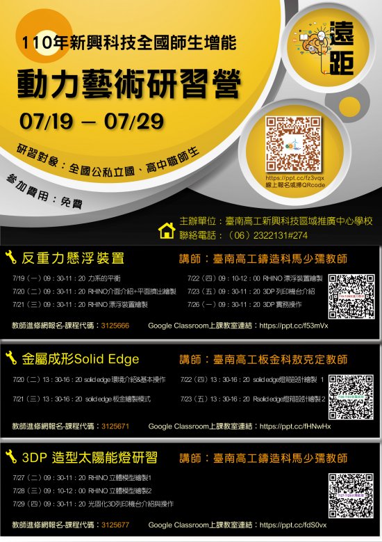 一、依據「110 年度教育部國民及學前教育署辦理補助前瞻基礎 建設數位建設---高級中等學校新興科技教育遠距示範服務 計畫之區域推廣中心」計畫辦理。 二、參加對象:國中、高中職師生。 三、報名方式:詳見研習簡章及附件。 四、上課方式:遠距教學 五、如對活動有任何疑義,請逕洽聯絡窗口:本校資訊室林助 理。電話:(06)2322131 轉 274 。