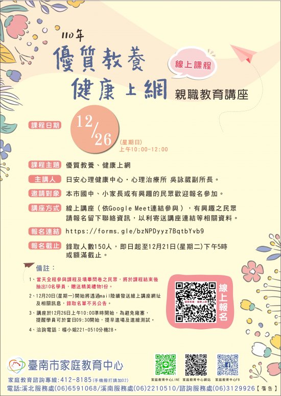 2 、有興趣之民眾請報名留下聯絡資訊,以利寄送講座連結等相關資料。