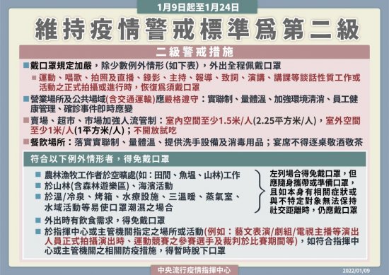 因應嚴重特殊傳染性肺炎國際間新變異株Omicron威脅,中央流行疫情指揮中心宣布自本(111)年1月9日至本年1月24日維持疫情警戒標準為第2級