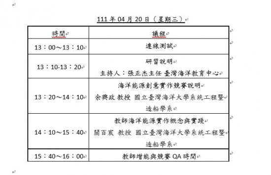 一、依教育部 110 年 7 月 5 日臺教國署高字第 1100068267 號函辦理。 二、說明會辦理時間及地點: (一)辦理時間: 111 年 04 月 20 日(星期三)13:00 至 16:00 。 (二)線上會議連結: https://meet.google.com/oyw-wowh-ezi (三)「全國教師在職進修資訊網」 課程代碼: 3402306 。 (四)檢附旨揭計畫說明書及競賽行事曆(附件)。 (五)歡迎各直轄市及縣(市)政府高級中等教育及國民中學教師踴躍報名參加。