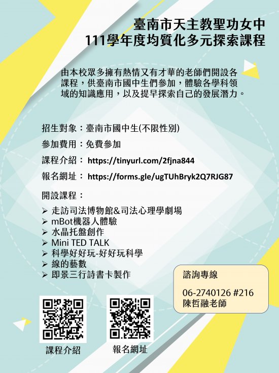 五、開設課程: mBot 機器人體驗、水晶托盤創作、 Mini TED TALK 、科學好好玩-好好玩科學、線的藝數、走訪司法博物館&司法心理學劇場、即景三行詩書卡製作。課程內容介紹: https://tinyurl.com/2fjna844