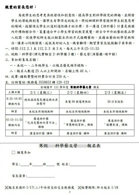 請全校有報名參加【寒假科學藝文營】的同學2/1(三)8:15至理化實驗室2集合簽到