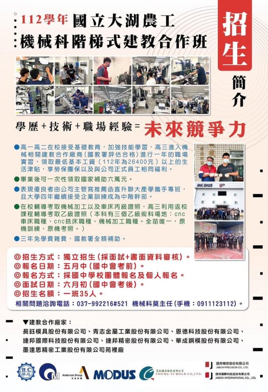 二、該班採獨立招生管道,招收機械科 1 班共計 35 名(性別不限),不受就學區限制,且高中三年免學雜費,詳如簡章。