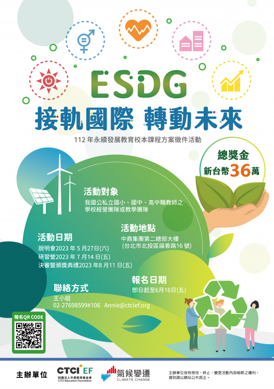 一、強化我國教育人員對於永續發展教育(ESD)與聯合國永續發展目標(SDGs)的認識,並了解國際上正在發生的新趨勢: ESD+SDG=ESDG ,以此思維與框架設計校本位課程,接軌國際趨勢,發揮學校特色,並將 SDGs 融入校本課程,呼應全球與在地關鍵永續發展議題,提昇全校師生之永續發展素養。中鼎教育基金會(CTCIEF)與教育部氣候變遷教育計畫共同籌辦「ESDG 接軌國際、轉動未來-112 年永續發展教育校本課程方案徵件活動」。
