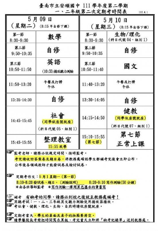 安順國中第二學期一二年級第二次定期考時間表-請參閱附件