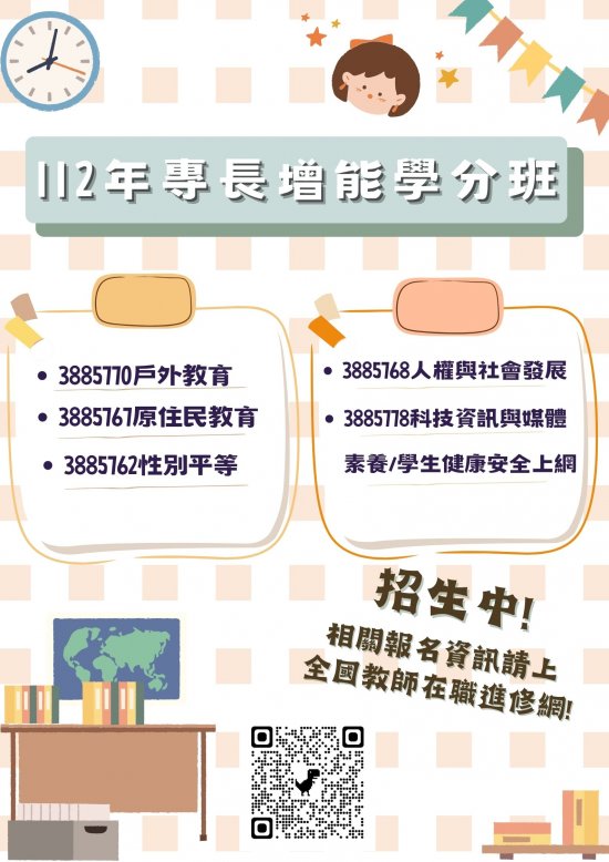 一、旨揭學分班業經教育部 112 年 5 月 29 日臺教師(三)字第 1122601940H 號函核定辦理,學分班課程有:「性別平等」、「戶外教育」、「人權教育-人權與社會發展」、「科技資訊與媒體素養/學生健康安全上網」及「原住民教育」等 5 個班各 2 學分,學分費由教育部全額補助。