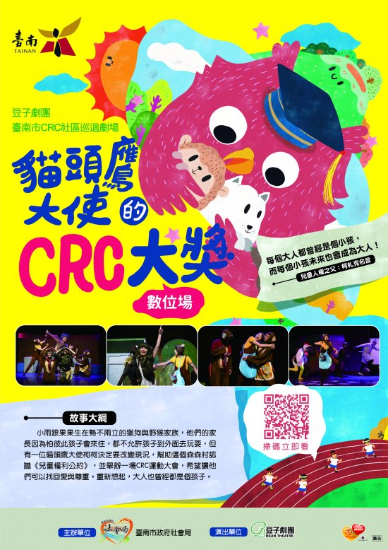 一、為營造友善兒少地方生活圈,持續促進兒少及成人在日常事務積極考慮、落實《兒童權利公約》所載之權利,本局委託豆子劇團製作「貓頭鷹大使的 CRC 大獎」公播版影片,藉由深入淺出的表演方式、淺白易懂的對白語彙、感人的情節與熱鬧的歌舞,讓兒童權利得以在故事演繹的形式中有深度地傳遞,潛移默化地影響社區內的兒少及其照顧者,達到跨世代間的共好及共融日常。