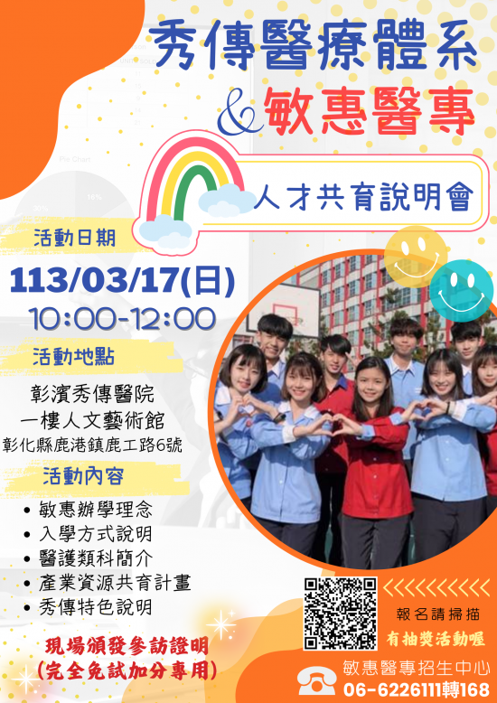 主旨:本校與秀傳醫療體系舉辦人才共育暨五專入學說明會,敬邀貴校學生、家長報名參加。