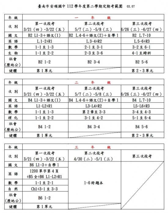 112學年度下學期段考時程及範圍
