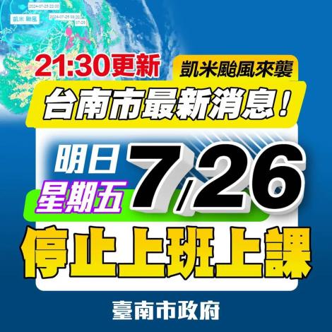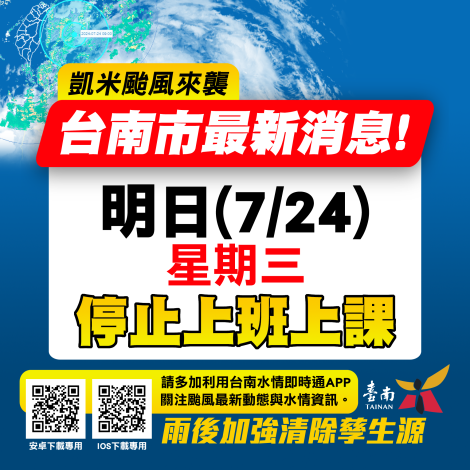 根據中央氣象署颱風雨量風力預測,評估 7 月 24 日本市沿海地區將出現 10 級以上陣風,已達停班停課標準,為維護市民安全及準備各項應變作為,臺南市政府宣布,明(7/24)日停止上班、停止上課