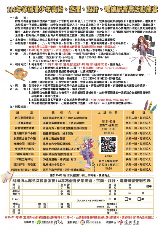 七、報名時間: 113 年 11 月 01 日(星期三)起至 114 年 1 月 05 日(星期五)前,額滿為止。任何課程相關問題,聯絡電話( 02 ) 2926-2121 轉 226~229 。