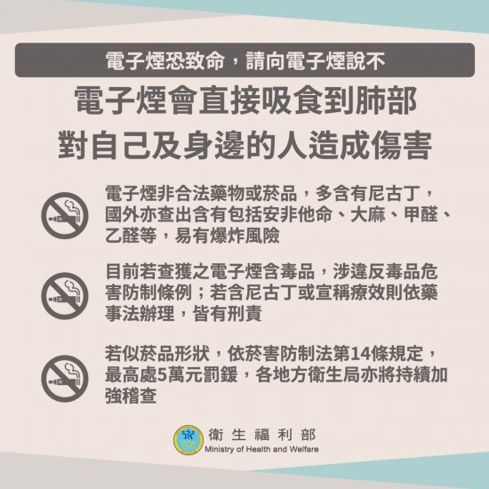 (五)衛生福利部臉書貼文「電子煙恐致命,請向電子煙說不」(如附件 2)。