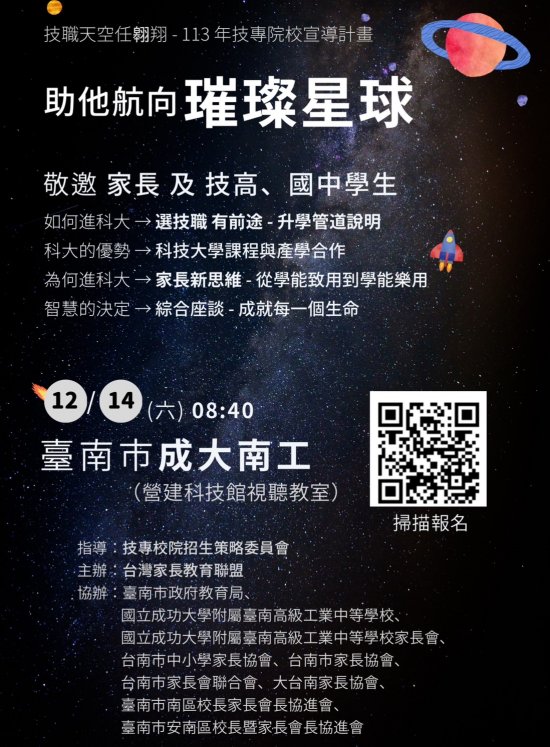 一、目的:為有效呈現技職教育多面向,產業發展多樣貌,有效翻轉家長對於技職之刻板印象,邀請技職端、技專端及業界與家長面對面說明未來進路及發展。