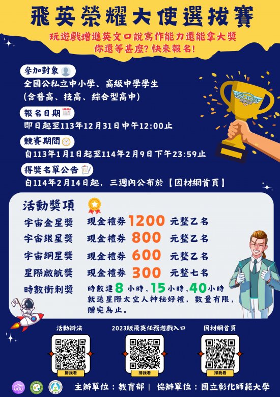 二、為提升全國中小學及高級中學學生的英語口說與寫作能力,教育部「高中英語文口說及寫作遊戲開發與推廣計畫」推出「SDGs 飛英大使年度排行榜積分賽」,邀請學生成為「飛英大使」。此遊戲式教材結合 SDGs 主題影片與互動任務,幫助學生提升聽力、口說及寫作能力,並鼓勵學生持續運用該平台素材強化英語學習動機。