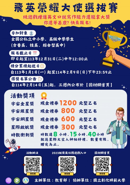 二、為提升全國中小學及高級中學學生的英語口說與寫作能力,教育部『高中英語文口說及寫作遊戲開發與推廣計畫』推出「SDGs 飛英大使年度排行榜積分賽」,邀請學生成為「飛英大使」。此遊戲式教材結合 SDGs 主題影片與互動任務,幫助學生提升聽力、口說及寫作能力,並鼓勵學生持續運用該平台素材強化英語學習動機。