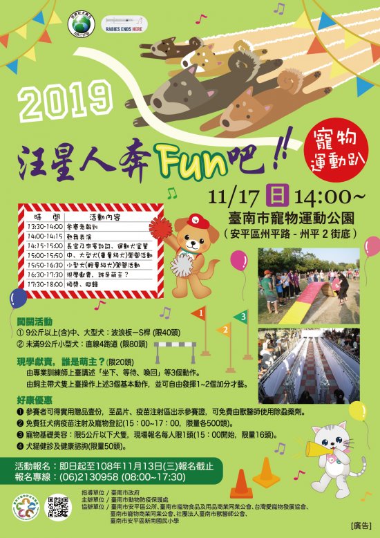 11/17 (日)下午 2:00 於安平區寵物運動公園舉辦寵物運動趴,報名專線( 06 ) 2130958 (額滿為止),參賽即贈實用好禮,詳情請見臺南市動保處網站,歡迎踴躍報名!