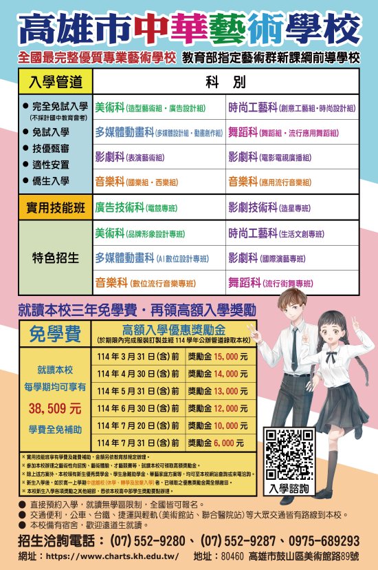 一、本校 114 學年度日間部正規班美術科、多媒體動畫科、時尚工藝科、影劇科、音樂科及舞蹈科與實用技能班廣告技術科(電競專班)、影劇技術科(造星專班)熱烈招生中,入學管道及相關資訊詳見招生 DM(如附件)。