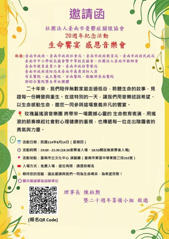 一、依據財團法人臺南市憂鬱症關懷協會(下稱憂協) 20 週年紀念活動─生命饗宴 感恩音樂會邀請函。