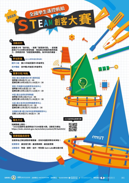 四、活動詳情與報名請參閱活動簡章,或至「2025 全國學生遙控帆船 STEAM 創客大賽」活動官網 https://mslc.nmmst.gov.tw/evtsite1/content/RCSail2025/