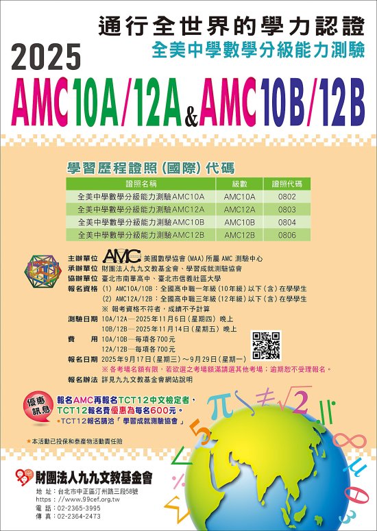 本會承辦美國數學協會( MAA )所屬 AMC 測驗中心『2025 年全美中學數學分級能力測驗 AMC10A/12A&AMC10B/12B』臺灣區測驗考試。敬請 貴校鼓勵學生踴躍報名參加。有關考試相關訊息請參閱本會官網
