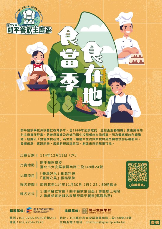 一、開平餐飲學校長年致力於推展餐飲專業教育,讓餐飲文化能向下紮根。自西元 1999 年起,由開平餐飲師生共同舉辦的「主廚盃餐飲競賽」,邀請業界主廚擔任評審,並公開講評指導,成為國中生難得可獲名廚親授經驗的校際交流賽事。本次主題是「食當季食在地」,希望透過此次活動,讓孩子們發揮創意實踐所學,透過料理展現自我,創造未來的無限可能。