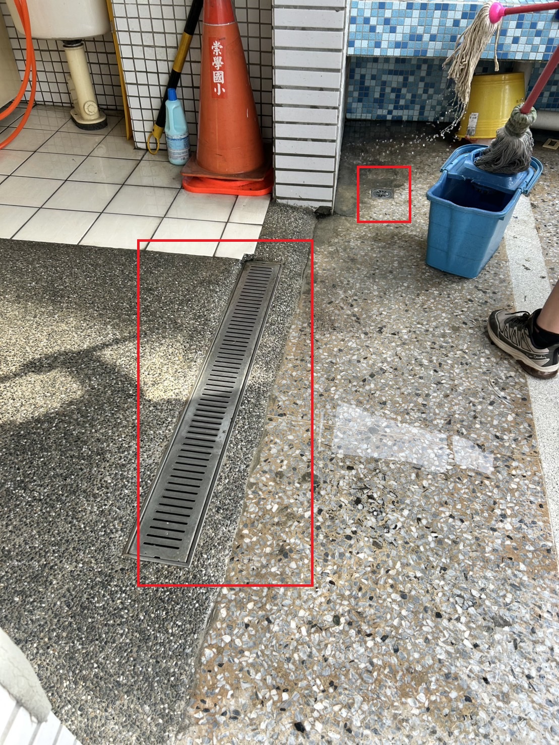 三樓英語教室(二)旁邊的廁所一版排水口, 2 處堵塞,會淹水。