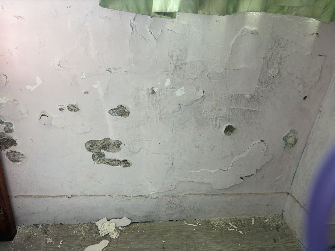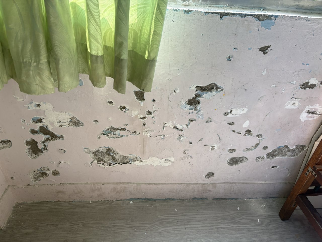 教室牆壁壁癌導致油漆牆面斑駁不堪、不斷有整片油漆連同水泥塊掉落