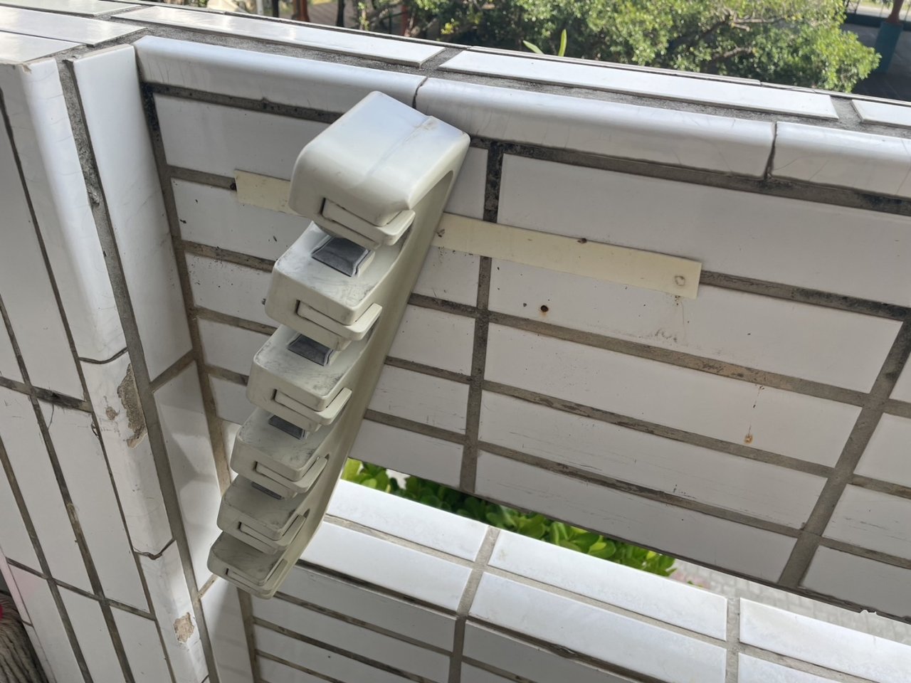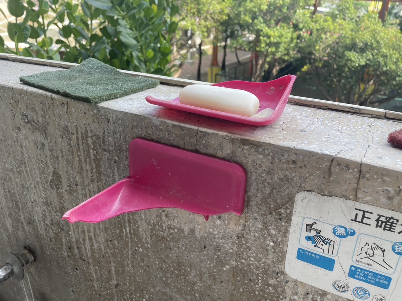 拖把架已半脫落無法使用,洗手台上肥皂盒因脆化斷裂
