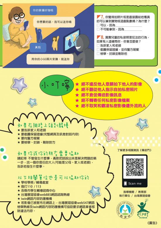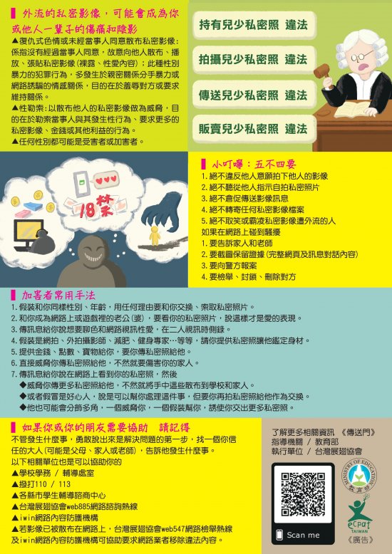 復仇式色情,又稱色情報復,係指未經過當事人同意而散布讓他人觀看當事人的私密影像、照片,甚而以此威脅當事人,常發生於親密關係(伴侶),涉及身體自主權、名譽等侵害,亦可能導致嚴重後果。因此請同學留意,勿隨意透過通訊軟體傳送個人私密影像及照片。