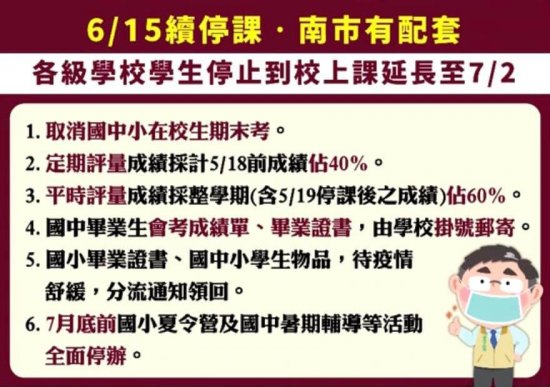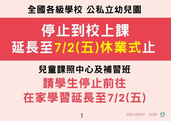 因應嚴重特殊傳染性肺炎疫情,全國實施疫情警戒第三級時間延長,為降低群聚感染之風險,維護學校師生健康及學習權益,教育部考量學期完整性,於本( 7)日宣布,全國各級學校及公私立幼兒園 109學年度第 2 學期停止到校(園)上課之期間,延長至 110 年 7 月 2 日止 (高中以下學校休業式),學生改採居家線上學習;兒童課後照顧服務中心、補習班等各類教育機構亦請所有學生停止前往,留在家中學習;學校實施線上教學方式、教職員工出勤管理及教師授課形式、家長服務措施,請依先前已實施方式辦理。