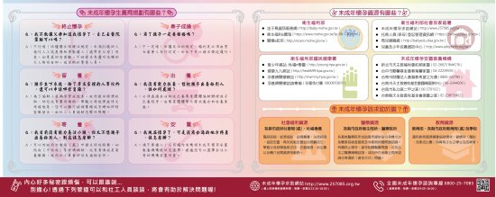 1. 「衛生福利部社會及家庭署全球資訊網」 (首頁/主題專區/家庭支持/未成年懷孕服務專區/民眾/宣導品)