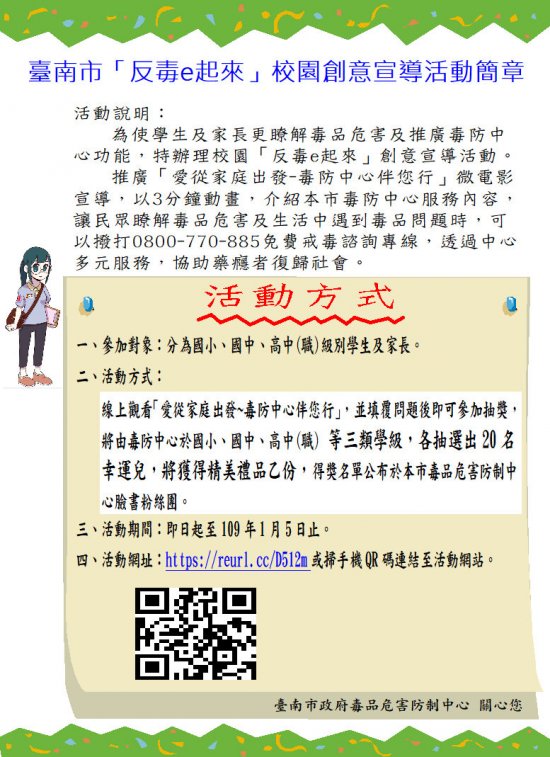 (四)檢附本市「反毒e起來」校園創意宣導活動簡章乙份(如附件)。