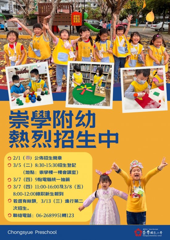 歡迎家長踴躍前往登記報名,崇學附幼是您最好的選擇!