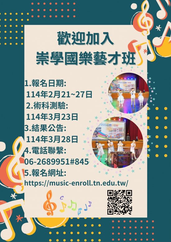 歡迎加入崇學國小國樂藝才班,我們誠摯邀請你的加入!簡章請詳閱附件。
