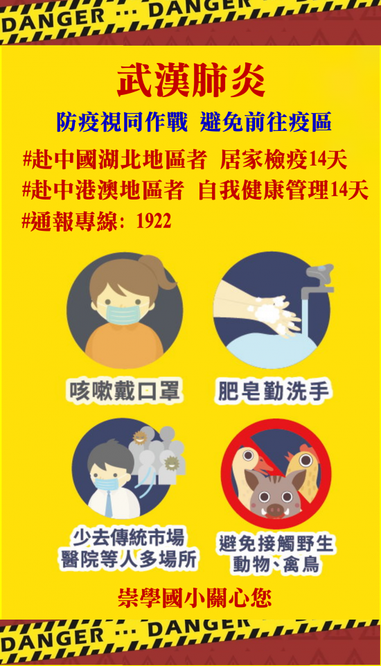 有鑑於國內武漢肺炎疫情升溫,為避免校園內爆發疫情,學校已成立防疫小組,推動各項防治工作。請務必配合辦理下列事項,一起為防疫工作努力!