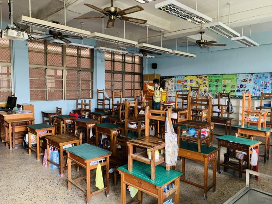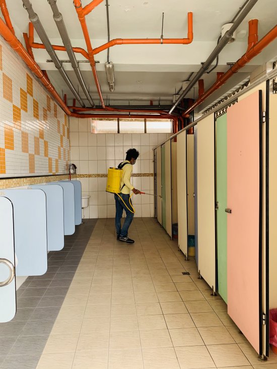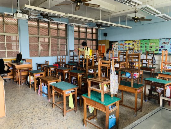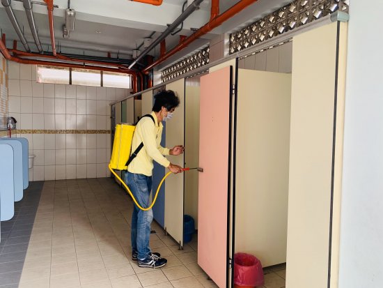 今日進行全校室內外空間環境消毒,感謝總務處同仁犧牲假期,為大家服務,希望給孩子們一個安全無虞的學習空間!防疫大家一起努力!