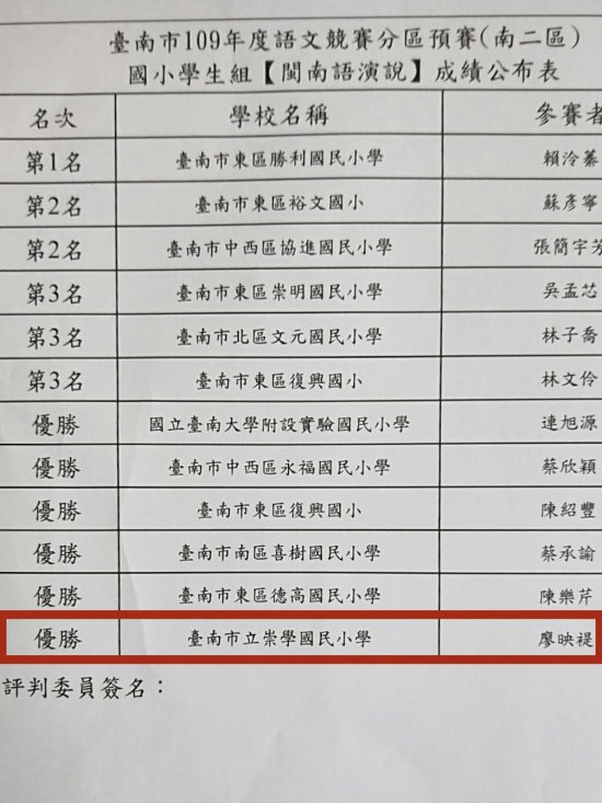 2.廖映褆同學榮獲全市閩南語演說優勝