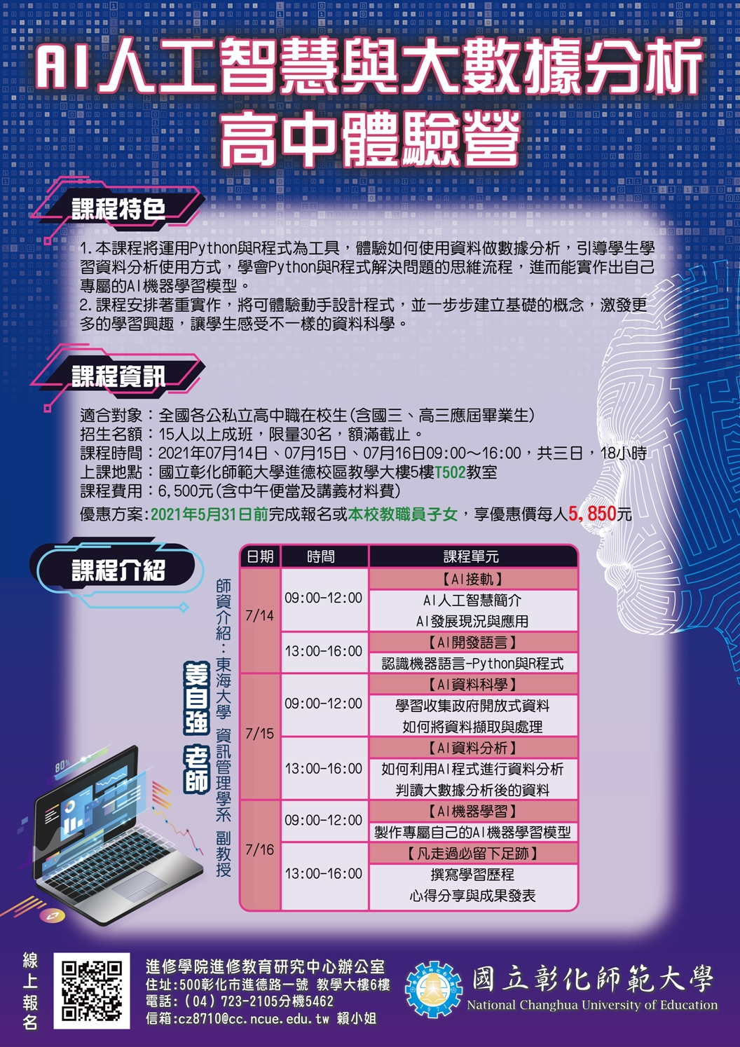 二、「AI 人工智慧與大數據分析高中體驗營」課程時間為 110 年 7 月 14~16 日 9:00-16:00 ,共 3 日,合計 18 小時,課程費用每人 5,850 元(含中午便當及講義材料費),即日起受理報名至 110 年 6 月 27 日(星期日)為止,如有課程相關問題,請逕向課程承辦人洽詢: 04-7232105 轉分機 5462 賴小姐。