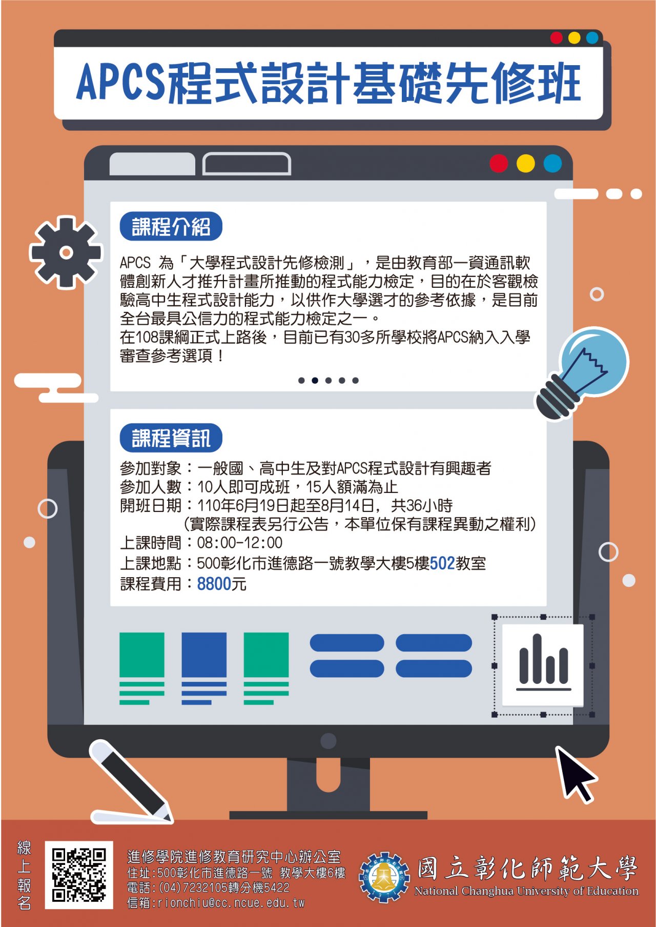 一、「APCS 程式設計基礎先修班」課程時間為 110 年 6 月 19 日~8 月 14 日(每週六)8:00-12:00 ,合計 36 小時,課程費用每人 8,800 元,即日起受理報名至 110 年 6 月 4 日(星期五)或額滿為止,如有課程相關問題,請逕向課程承辦人 洽詢: 04-7232105 轉分機 5422 邱小姐。