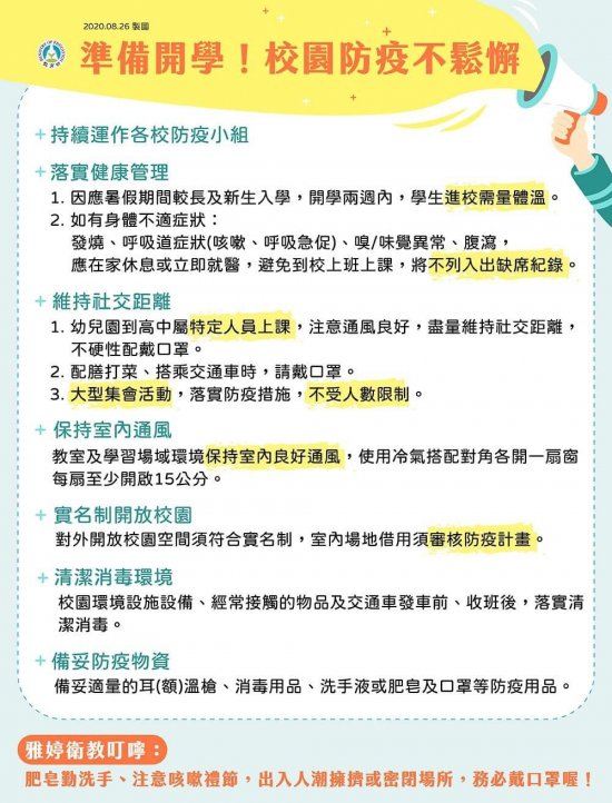 為在疫情期間維護師生健康及學生受教權益,教育部近日邀集防疫專家學者召開「109 學年度校園防疫工作諮詢會議」,研訂「109 學年度高級中等以下學校因應嚴重特殊傳染性肺炎防疫工作注意事項」,並報請中央流行疫情指揮中心同意,以供高級中等以下學校 109 學年度開學防疫工作準備。