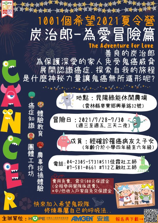 四、本活動訂於110年7月28日至30日在晁陽綠能休閒農場辦理,相關活動詳情請至官網(https://www.ecancer.org.tw)查詢,並可採下列任一方式繳交報名表: