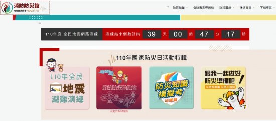 六、除了教育部防災教育資訊網外,內政部消防署消防防災館(https://www.tfdp.com.tw/cht/index.php)亦辦理 110 年國家防災日活動特輯,完成指定活動,亦可參與抽獎。