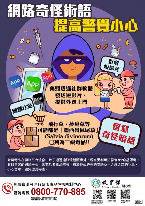 1 、「破解網路涉毒危機」及「網路奇怪術語 提高警覺小心」電子海報,請學校於相關研習、活動、會議等適當場合宣導、並運用網路各式平台(粉專、 IG 、官網等)加強宣導或透過電子看板撥放。